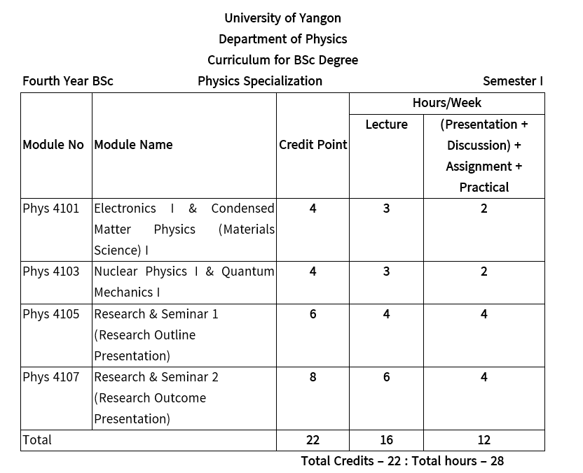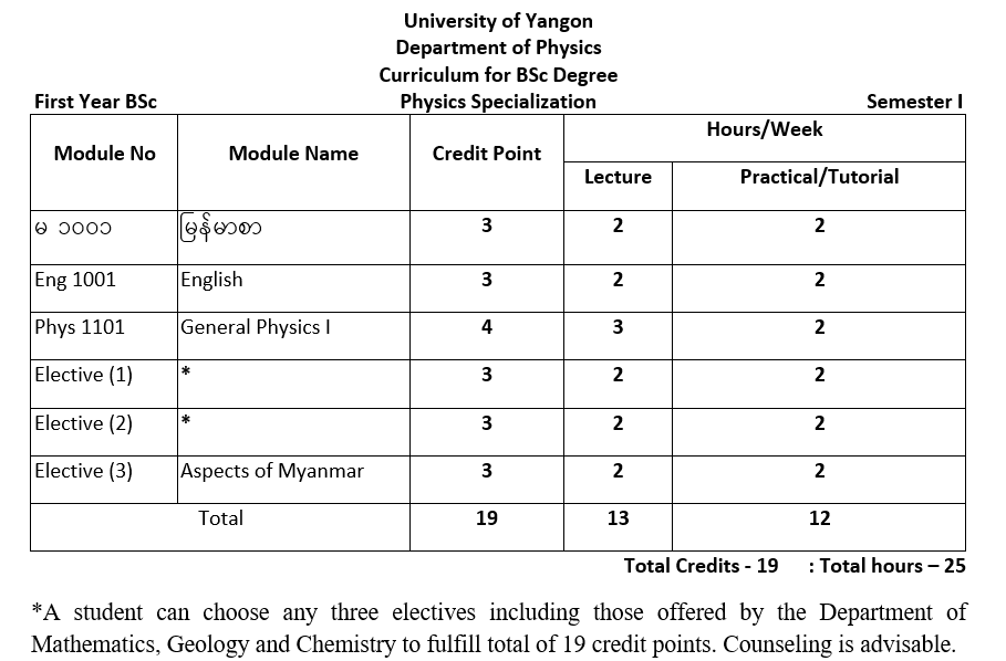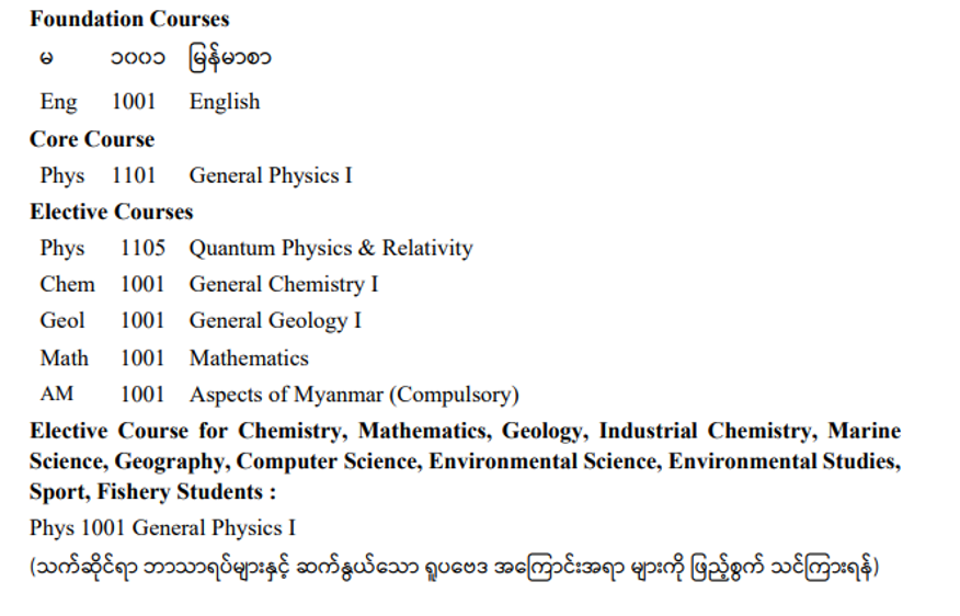 | ၁ | ပထမနှစ် | ရူပဗေဒ |